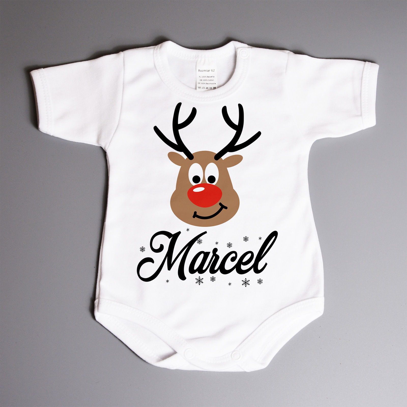 Własne Imię Dziecka: Zmień standardowe ubranko w wyjątkową pamiątkę! Podaj nam imię, jakie ma znaleźć się pod wesołym reniferem (np. Antoś, Zuzia, Kubuś).