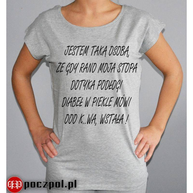 Damska koszulka z nadrukiem"JESTEM TAKA OSOBĄ, ŻE GDY RANO MOJA STOPA DOTYKA PODŁOGI DIABEŁ W PIEKLE MÓWI OOO K..WA, WSTAŁA !"