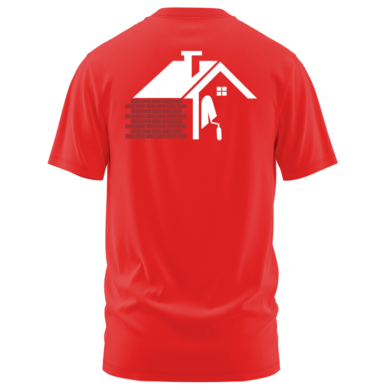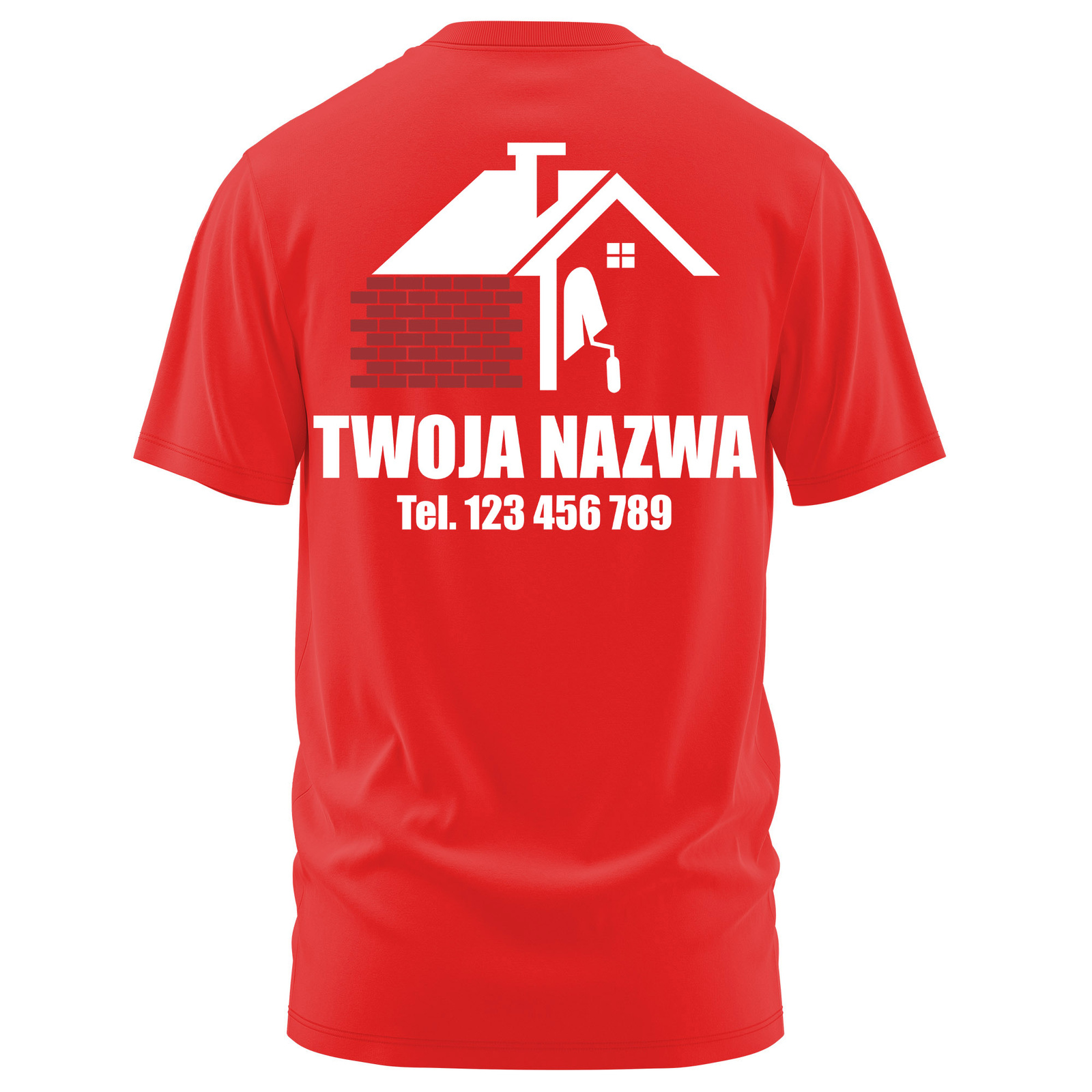 Koszulkadla firm budowlanych z małym nadrukiem z przodu i dużym na plecach.