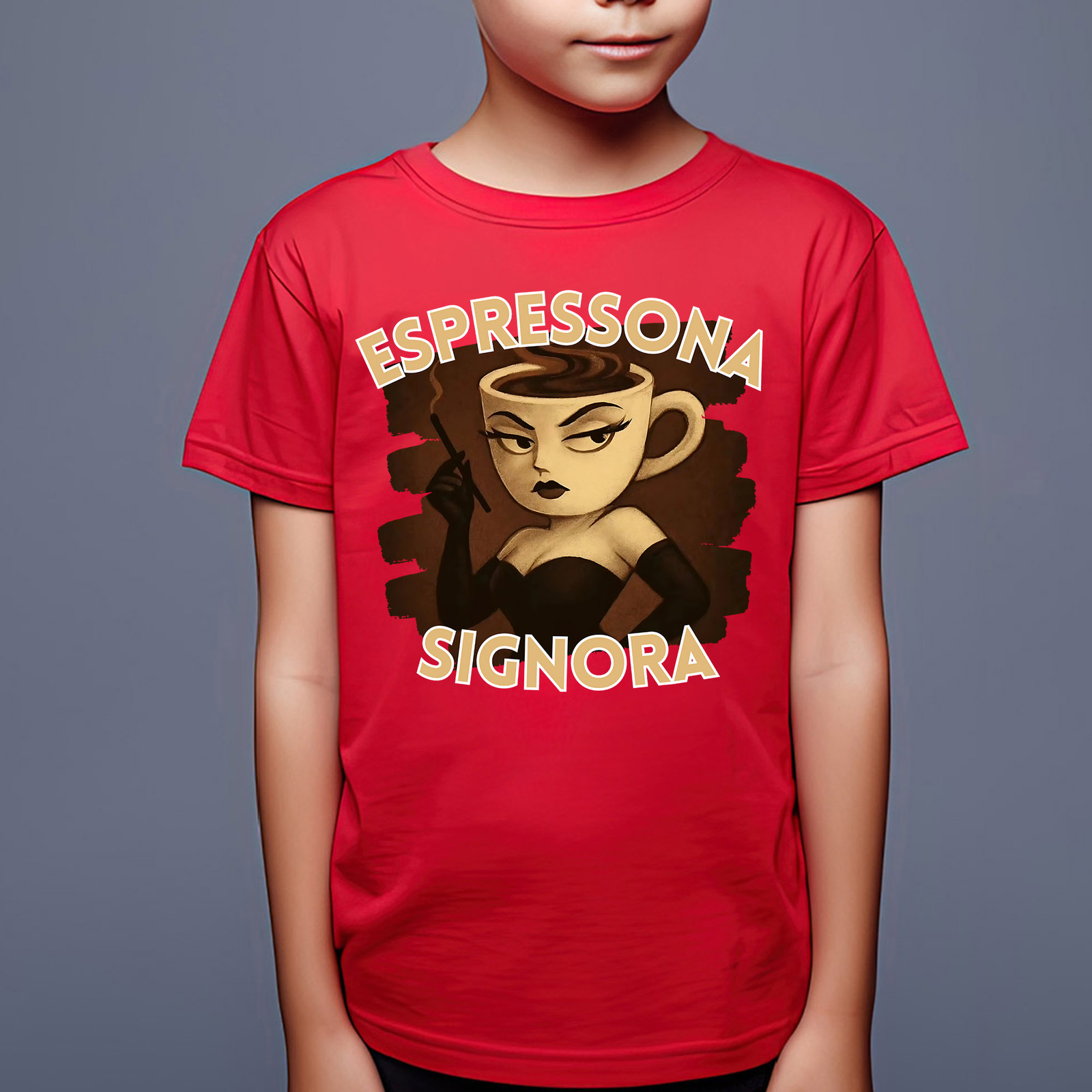Szukasz wyjątkowej koszulki, która rozśmieszy i zachwyci Twoje dziecko? Ta koszulka z zabawnym nadrukiem "Espressona Signora" to strzał w dziesiątkę!