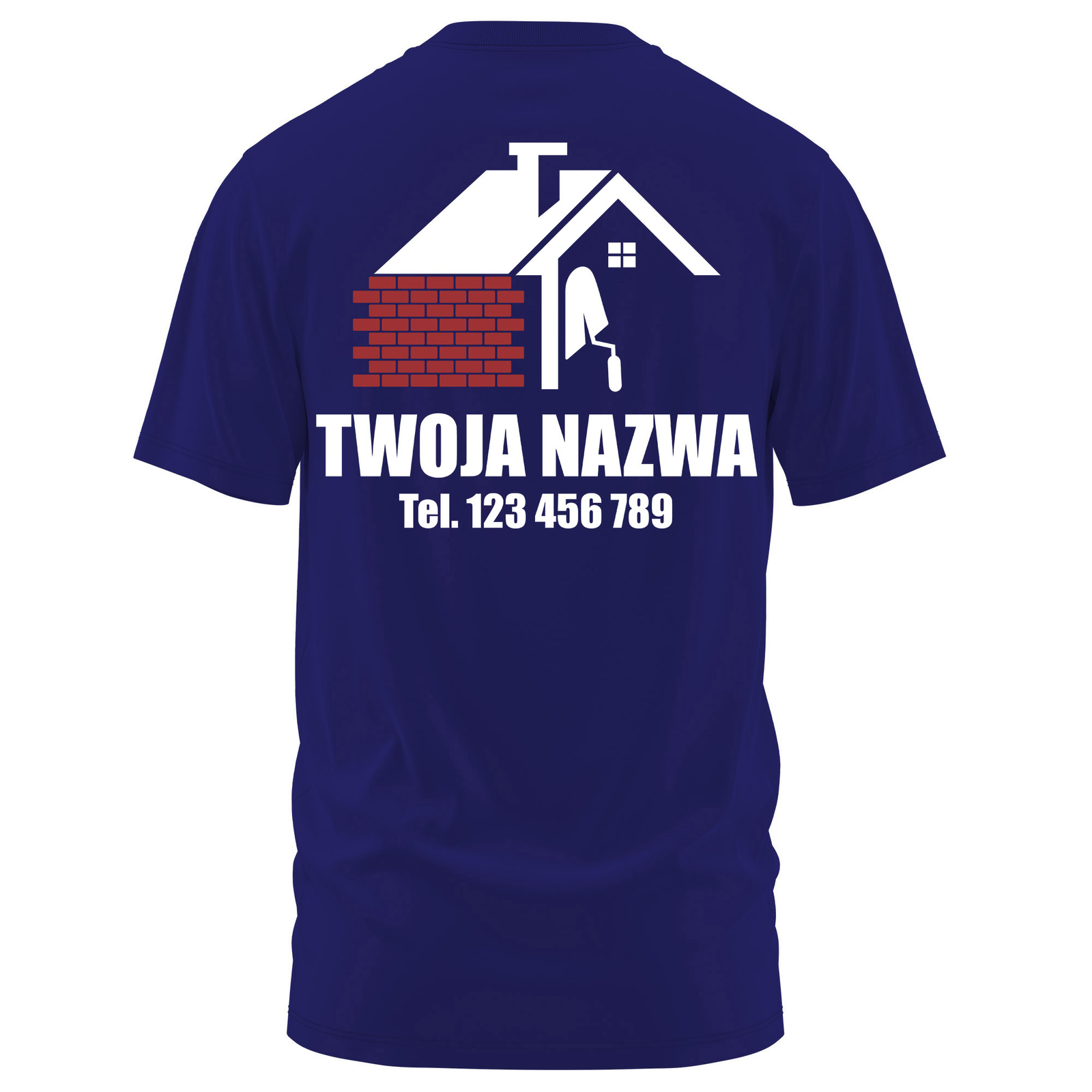 Koszulkadla firm budowlanych z małym nadrukiem z przodu i dużym na plecach.