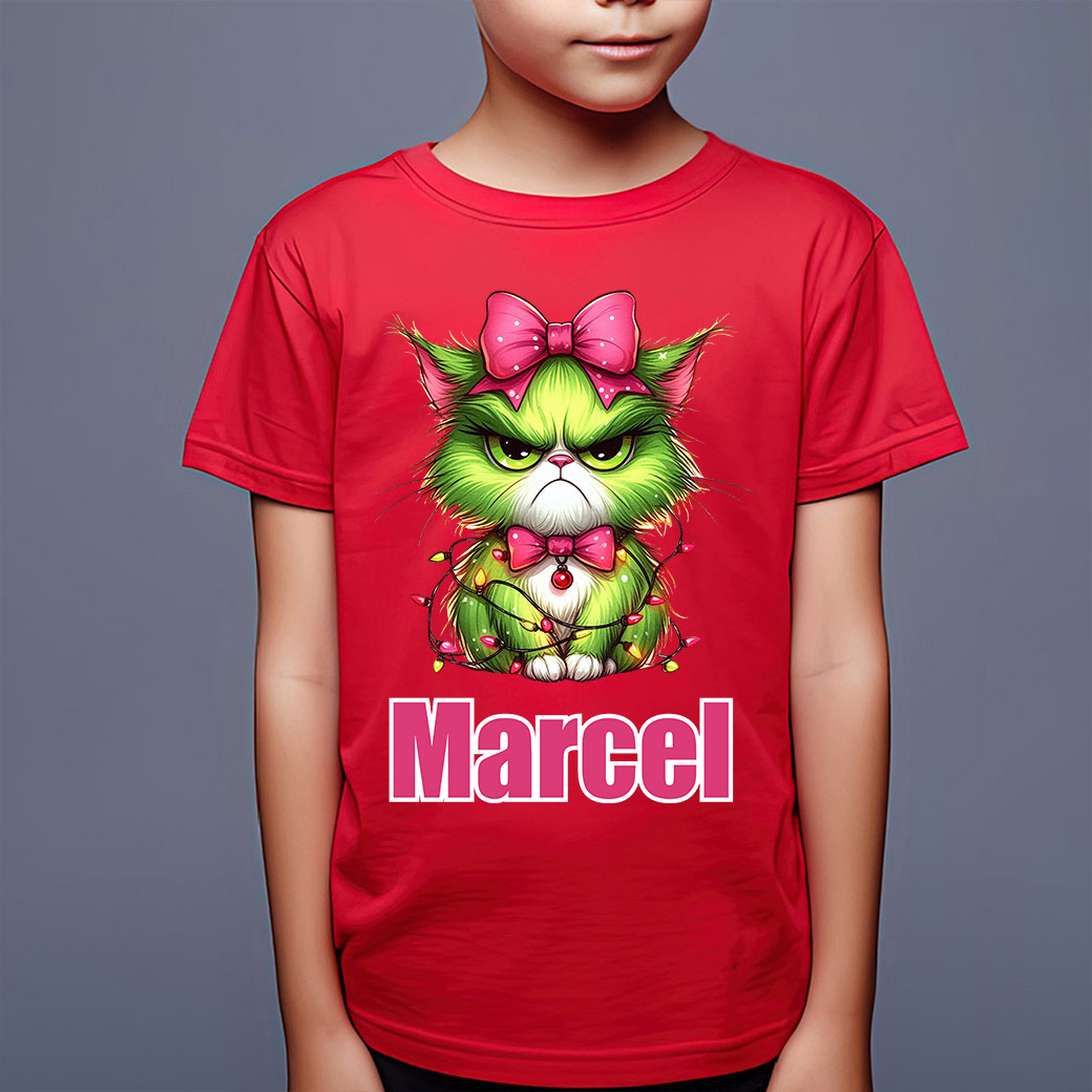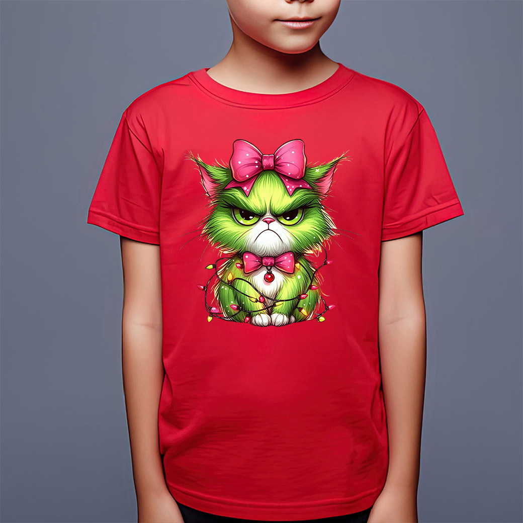 😼 UNIKALNY WZÓR - GRINCH-KOTEK! Nasz uroczo-wściekły, zielony kot w różowej kokardzie i oplątany lampkami to przezabawne połączenie świątecznego klimatu z lekkim pazurem. Idealny dla każdego małego fana kotów i świątecznych psot!