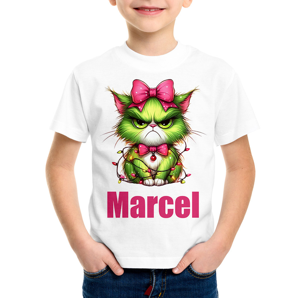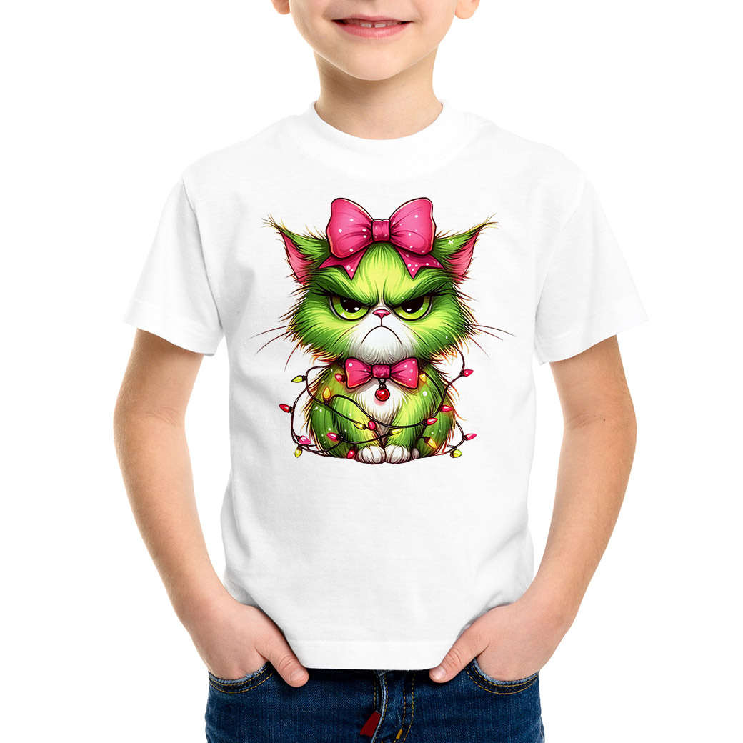 😼 UNIKALNY WZÓR - GRINCH-KOTEK! Nasz uroczo-wściekły, zielony kot w różowej kokardzie i oplątany lampkami to przezabawne połączenie świątecznego klimatu z lekkim pazurem. Idealny dla każdego małego fana kotów i świątecznych psot!
